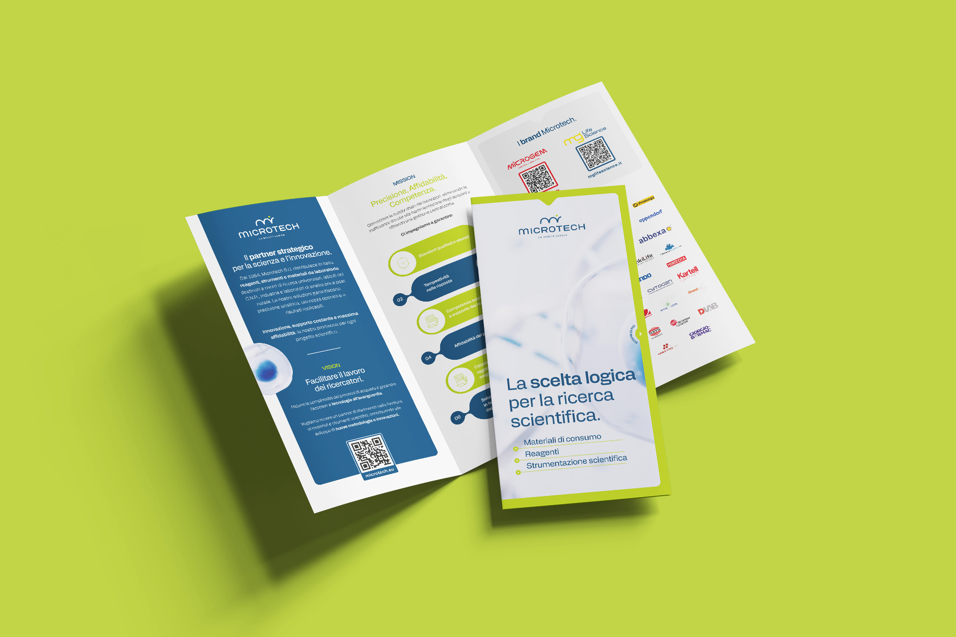 Il progetto ha coinvolto ogni punto di contatto del brand: dal sito web ai materiali per fiere, fino alla comunicazione quotidiana dell’azienda e delle sue divisioni, Microgem e MGLifeScience.